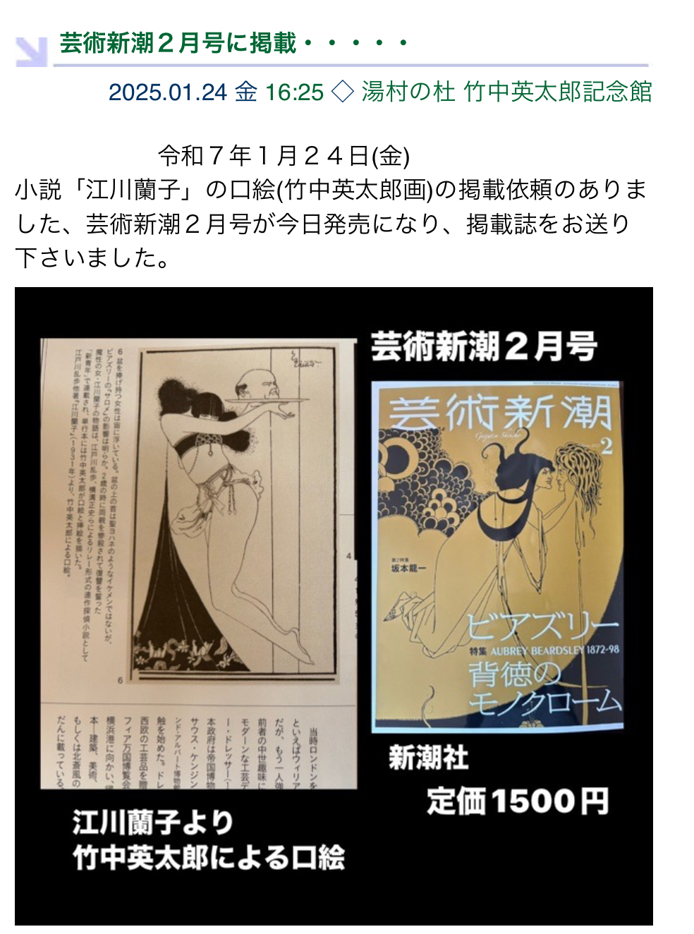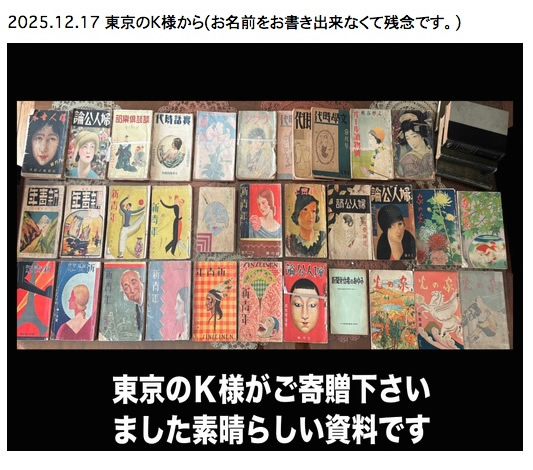 本年も大勢の方々のご協力を頂き、竹中英太郎記念館も、喜びで一年間を過ごすことが出来ました。又思いもかけなかった貴重な資料も揃い充実いたしました。ご寄贈下さいました方々に、亡・父、兄に代わり心より感謝して御礼申し上げます。