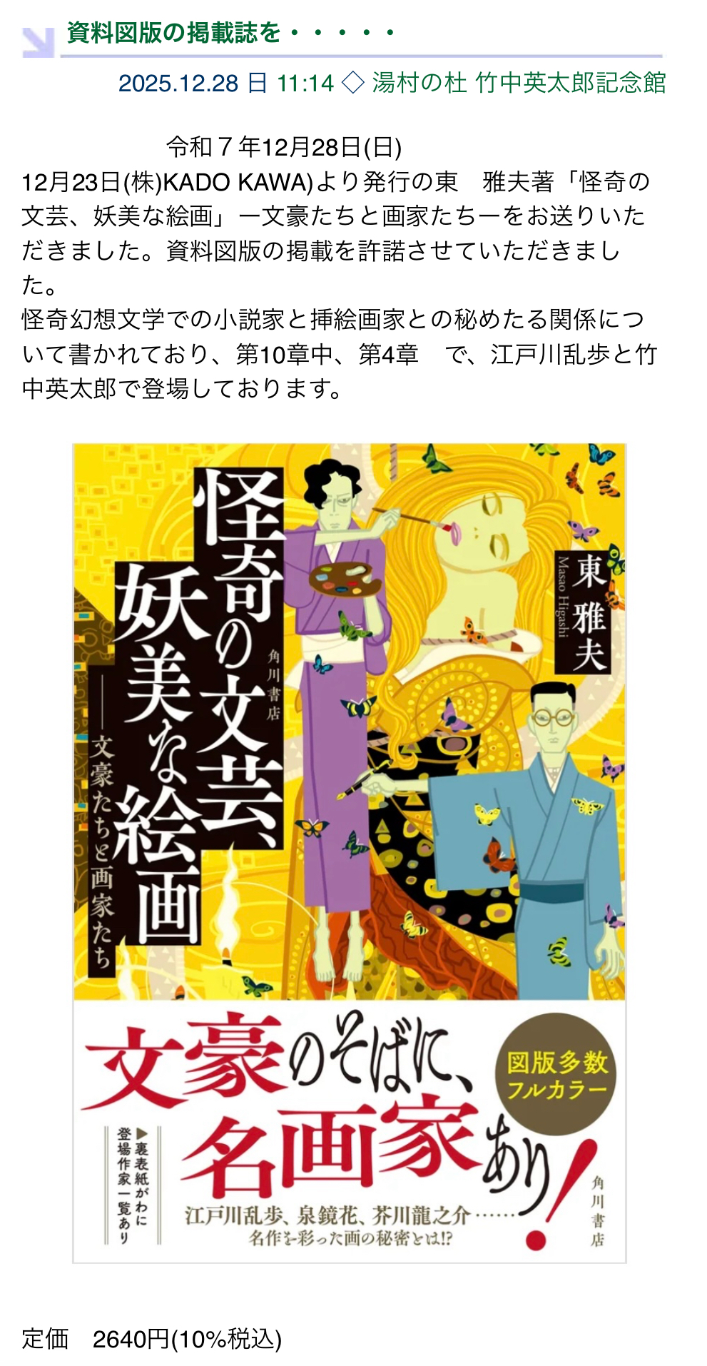 ① MM PROJECT文庫様が、開館20周年記念として、「銀座事件」三上於菟吉著・挿絵竹中英太郎を刊行して下さいました。今迄の怪奇的な絵ではなく銀座の雰囲気を醸し出す素敵な挿絵51点が掲載されております。
