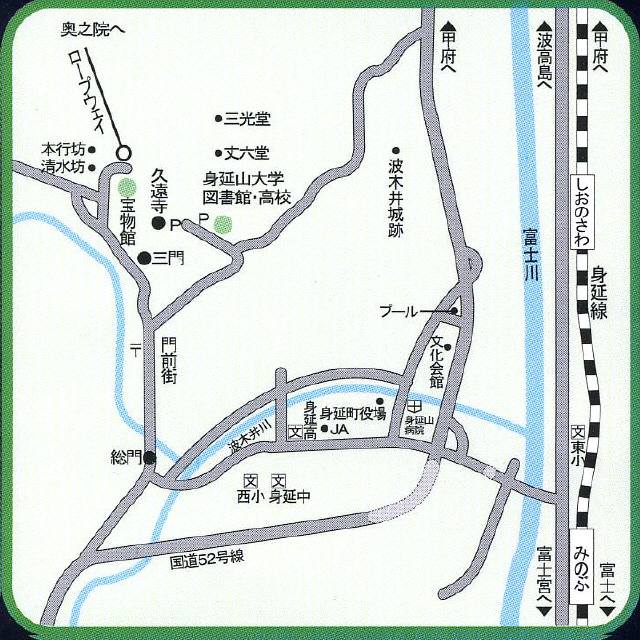 (山梨の美術館・博物館より身延山宝物館、身延町ホームページ、身延山久遠寺の交通案内・・・ポスターの地図を拡大します)