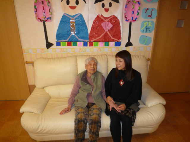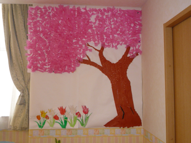 施設内には、お雛様の時に皆さんで作られた作品が壁に飾ってありました。義母は、チユーリップをつくり貼ったそうです。