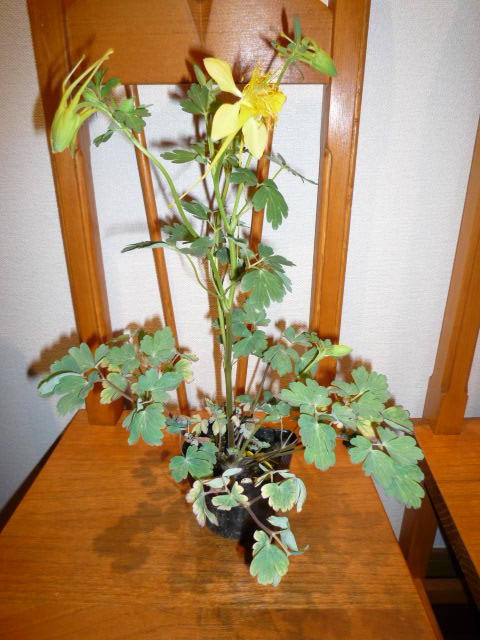 「黄おだまき」という山野草で、とても変ったお花のかたちをしております。