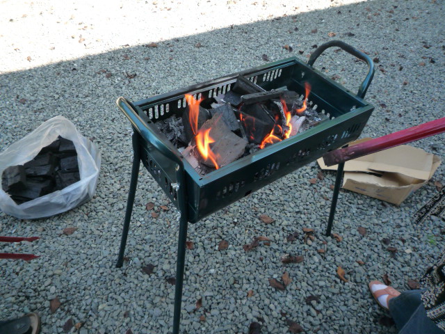 お昼、A.A様がおにぎりと秋刀魚とイカを持って来て下さり、初めて外で焼きました。火が強すぎくろ焦げになってしまいました。でも、皮を取り除いて食べましたが結構美味しくいただきました。イカは主宰が火が弱くなってから焼きましたので美味しかったです。