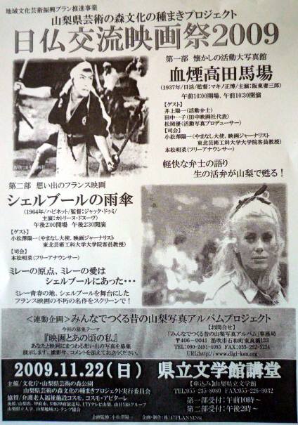 山梨県立文学館からの企画依頼で小松澤陽一様(やまなし大使、映画ジャーナリスト、東北芸術工科大学大学院客員教授)は、地域文化芸術振興プラン推進事業・山梨県芸術の森文化の種まきプロジェクト「日仏交流映画祭2009」の企画、監修をされていらっしゃる方でした。