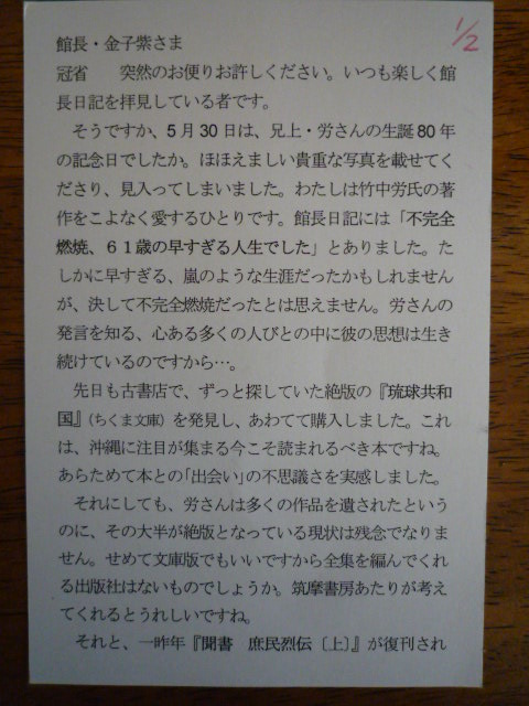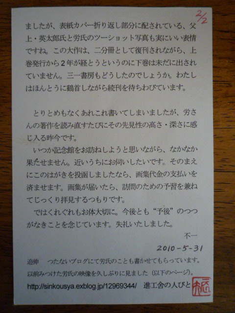 労さんの著作を愛されて(6月4日・ブログ)でご紹介させて頂きましたM.U様のお便り、昨日コメントでご許可を頂きましたので、あらためて全文をご紹介させて頂きます。