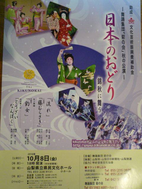 今晩は、山梨県立県民文化ホールで開催されます舞踊集団「菊の会」の「日本のおどり―錦秋に舞う」を観に行ってまいります。今年はどんな舞台を拝見できますか楽しみです。