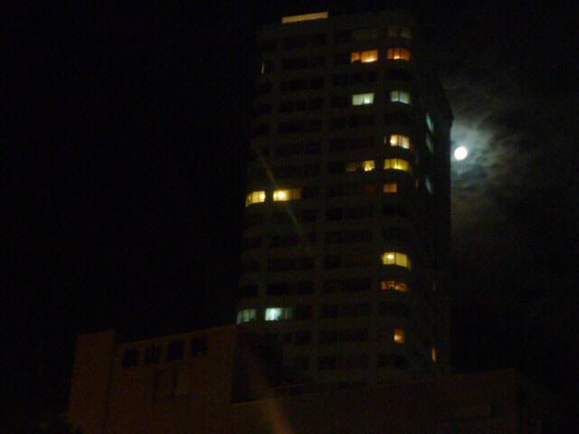 高層マンションの後ろから満月が、、、、。幻想的で素敵でした。