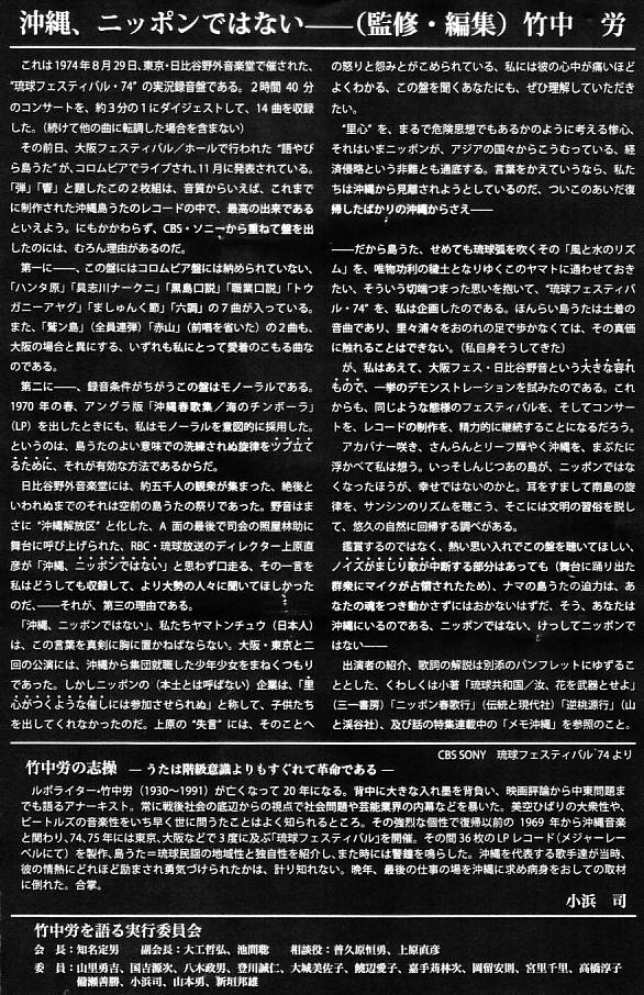 5月12日(木)←(クリックされてご覧下さい)のブログでご案内させて頂きました、5月19日、那覇市で開催されます、あれから20年竹中労を偲ぶ会「語やびら島唄」チラシの裏に、労さんの抜粋された文章(CBSSONY 琉球フェスティバル”74より)が載っておりましたので、ご紹介させて頂きます。