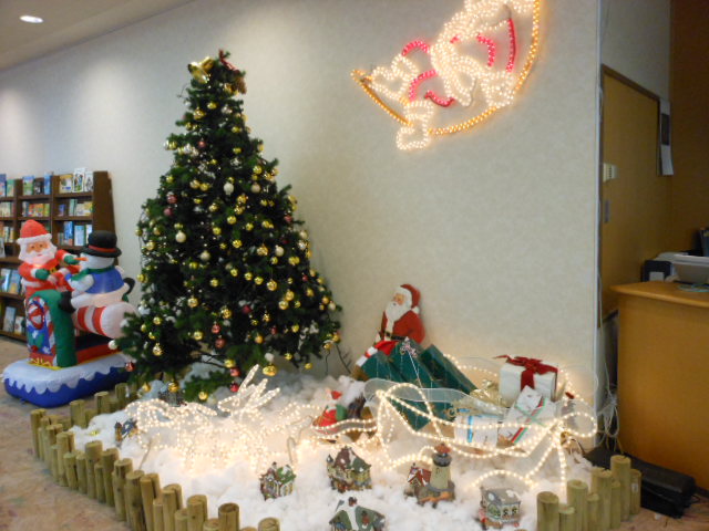 昨日からお世話になっております大泉高原・ロイヤルホテル(←クリックされてご覧下さい)のクリスマスツリー&サンタさん達。