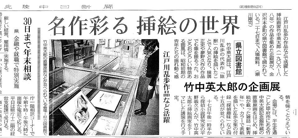 平成12年12月2日のブログ(←クリックされてご覧下さい。)でご案内させて頂きました「竹中英太郎作品展」につきまして、石川県立図書館(←クリックされてごらんください。)上田敬太郎様より、資料をご送付頂きましたのでご紹介させて頂きます。