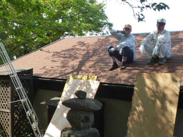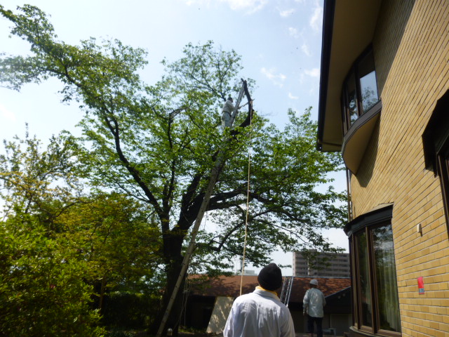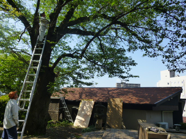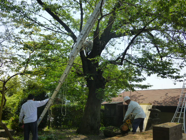 ご近所でいつもお世話になっております猪俣秀男様、加藤工業の社長様と主宰の三人での作業、10メートル以上あります桜の木、みているだけでひやひやしてしまいました。かたちも良くなり、これで強風がふいても心配はなくなりました。