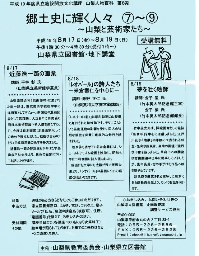 山梨県立図書館様より、「県立施設開放文化講座について」、今回「山梨人物百科」として、本県の芸術分野で活躍した人を取りあげ、各人の生き方や業績、著書等について学ぶ事の出来る人物講座に竹中英太郎が選ばれ、竹中英太郎についての講演を下記の通り行う事になりました。