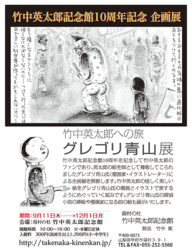 今年は、湯村の杜・竹中英太郎記念館、開館10周年記念「竹中英太郎への旅・グレゴリ青山展」という大きなイベントを9月11日(木)から12月1日(月)まで、開催致しました。