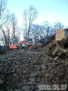 今日の湯村山遊歩道工事は、湯谷神社側の伐採と遊歩道をつくって地ならしをしたあと、記念館側の大木を伐採し、根を引き抜いた所で作業を終了しました。