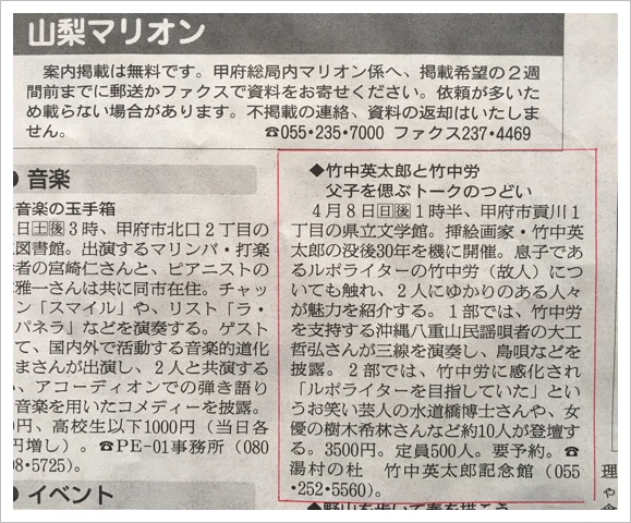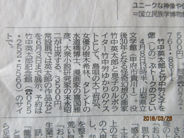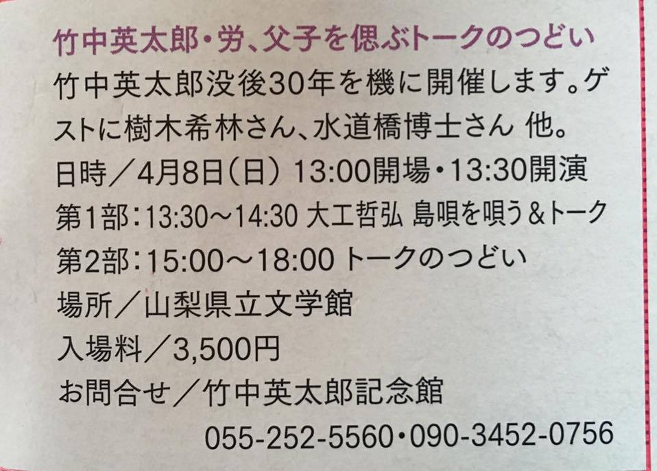 平成28年10月15日(土)に桜座(山梨県甲府市)で開催致しました”竹中労没後25年 今ふたたび「戒厳令の夜」特別上映会と労を偲ぶトークのつどい” 、5月31日号で平成30年4月8日(土)に山梨県立文学館で開催致しました”竹中英太郎没後30年「竹中英太郎と竹中労父子を偲ぶトークのつどい”のゲスト出演して下さいました時の事をお書き下さいました。