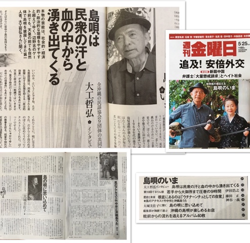 シリーズ沖縄「琉球狐の魂伝える・島唄のいま」として、大工哲弘氏、藤田 正氏、大城美佐子様方が、それぞれの思いを語っておられます。オフノート・神谷一義氏は、労さんの事を「風のアナキスト竹中労と沖縄島唄」と題してお書き下さいました。
