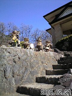 いつの間にか、お出迎え君が4人になりました。バイオリン、太鼓、笛など楽器を持って演奏中、湯村の杜にかわいい音楽隊の誕生です。