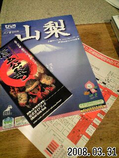 Y様が山梨デスティネーションキャンペーン(4月1日〜6月30日)の冊子や信玄公祭り「4月5日(土)甲州軍団出陣」のパンフ等をお持ち下さいました。また、今日は(財)山梨公園公社・山梨フルーツパーク(株)さまからフルーツ公園イベントポスター(平成20年度の各種事業を掲載)掲示依頼がございました。