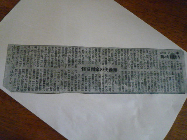 平成16年4月10日、記念館をオープンしました際、長野にお住まいでした父の新聞記者時代の友人古川寿一(故人)様がご紹介して下さいました掲載紙「市民タイムズ」の切り抜きをお持ちくださいました。「古川寿一の聞いたり見たり」を読まれ、江戸川乱歩・横溝正史などの小説の挿絵を描いていたのが「竹中英太郎」だった事をはじめて知られたそうです。松本から記念館のためにだけお出でくださいました事をお聞きし、本当に有難く思いました。そしてお帰りの際、これからどちらへお出でになりますか?とお尋ね致しましたら、「記念館に来れた事だけで本望ですから」とおっしゃって下さいました。お車お気をつけてお帰り下さいますよう。