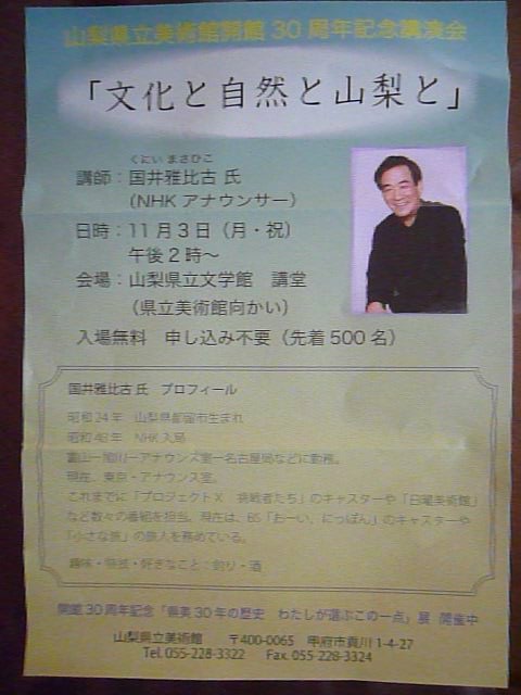 様より、山梨県立美術館開館30周年記念講演会「文化と自然と山梨と」のチラシ掲示のお願いが御座いましたので、ご紹介させて頂きます。写真が不鮮明ですが、クリックしてご覧下さい。